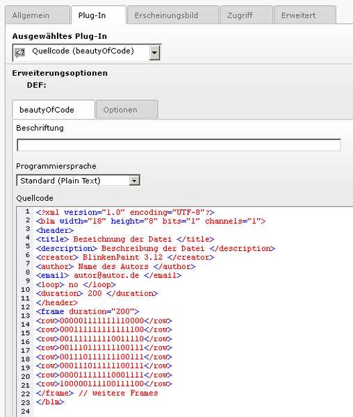 Zur Einbindung von Quelltext nutzen Sie unter den Inhaltselementen Plug-Ins eine Extension mit dem Namen "Quellcode (beautyOfCode)". Mit diesem Inhaltselement ist es möglich, Programmiercode der verschiedensten Art in einer nichtproportionalen Schrift übersichtlich darzustellen. Dabei lässt sich sogar eine Zeilennummerierung dazu- oder abschalten. Hier ein Beispiel